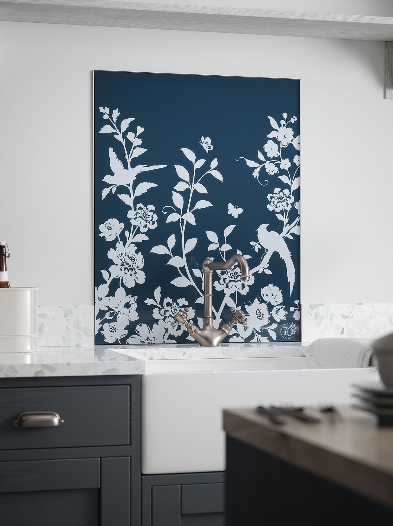 Designed to celebrate 70 years of the iconic Laura Ashley brand, this Special Edition splashback is a rework of a classic Laura Ashley wallpaper, Oriental Garden, with silhouettes of stylised blooms, butterflies and fabulous birds of paradise. Inspired by the outdoors, this stunning splashback in shimmering deep blue is designed to create a restful and soothing kitchen space.